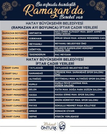 HBB İFTAR ÇADIRLARI TÜM KENTTE Hatay Büyükşehir Belediyesi il genelinde hazırladığı iftar çadırları ile ramazan ayının bereketini kuracağı iftar sofralarına taşıyor. HBB Sağlık ve Sosyal Hizmetler Dairesi Başkanlığı yarın başlayacak Ramazan Ayı münasebetiyle 15 ilçede iftar çadırları kuruyor. Ekipler, Ramazan ayı boyunca Antakya’da Hacı Ömer Alpagot Mah. Şehit Ahmet Çerçi Sokak, İskenderun’da PAC Meydanı, Kırıkhan’da Mimar Sinan Mahallesi Adnan Menderes Caddesi, Reyhanlı’da Reyhanlı Belediyesi önü ve Dörtyol’da Belediye karşısı eski Hükümet Konağı’nın yerinde iftar çadırları kurarak vatandaşlara sıcak yemek verecek. Ayrıca 7 Mart Cuma günü Yayladağı Belediyesi Önü, 11 Mart Salı Günü Samandağ Spor Salonu, 14 Mart Cuma Altınözü Spor Salonu, 15 Mart Cumartesi Kumlu Fevzi Çakmak Mahallesi Düğün Salonu, 17 Mart Pazartesi Belen Fatih Mahallesi Doğa Park Düğün Salonu, 20 Mart Perşembe Ha