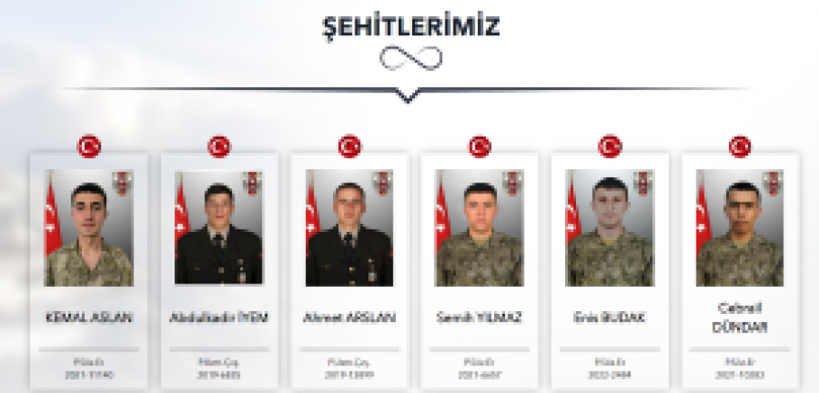 Piyade Uzman Çavuş Abdülkadir İyem, Piyade Uzman Çavuş Ahmet Arslan, Piyade Sözleşmeli Er Cebrail Dündar, Piyade Sözleşmeli Er Semih Yılmaz, Piyade Sözleşmeli Er Kemal Aslan, Piyade Sözleşmeli Er Enes Budak adlı Kahraman silah arkadaşlarımız ise 22 Aralık 2023 tarihinde Şehit olmuşlardır.