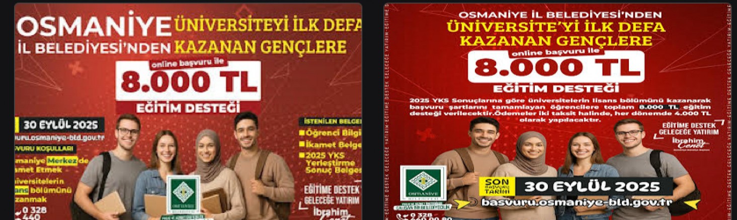 Osmaniye Belediyesi, “Eğitime destek, geleceğe yatırım” sloganıyla üniversiteyi ilk kez kazanan öğrencilere 8 bin TL eğitim desteği sağlayacak. 2025 YKS sonuçlarına göre üniversitelerin lisans programlarına yerleşen ve başvuru koşullarını yerine getiren öğrencilere yapılacak destek ödemeleri, iki taksit halinde gerçekleştirilecek. Öğrencilere güz döneminde 4 bin TL, bahar döneminde ise 4 bin TL olmak üzere toplamda 8 bin TL ödeme yapılacak.