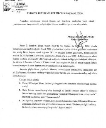 Yapımına 2018 yılında başlanan, kaba inşaatı biten, 6 Şubat depremi sonrasında sağlam olmasına rağmen orta hasarlı diye yıkımına başlanan Hatay Emniyet binası, CHP Hatay Milletvekili Mehmet Güzelmansur tarafından Meclis gündemine taşındı.